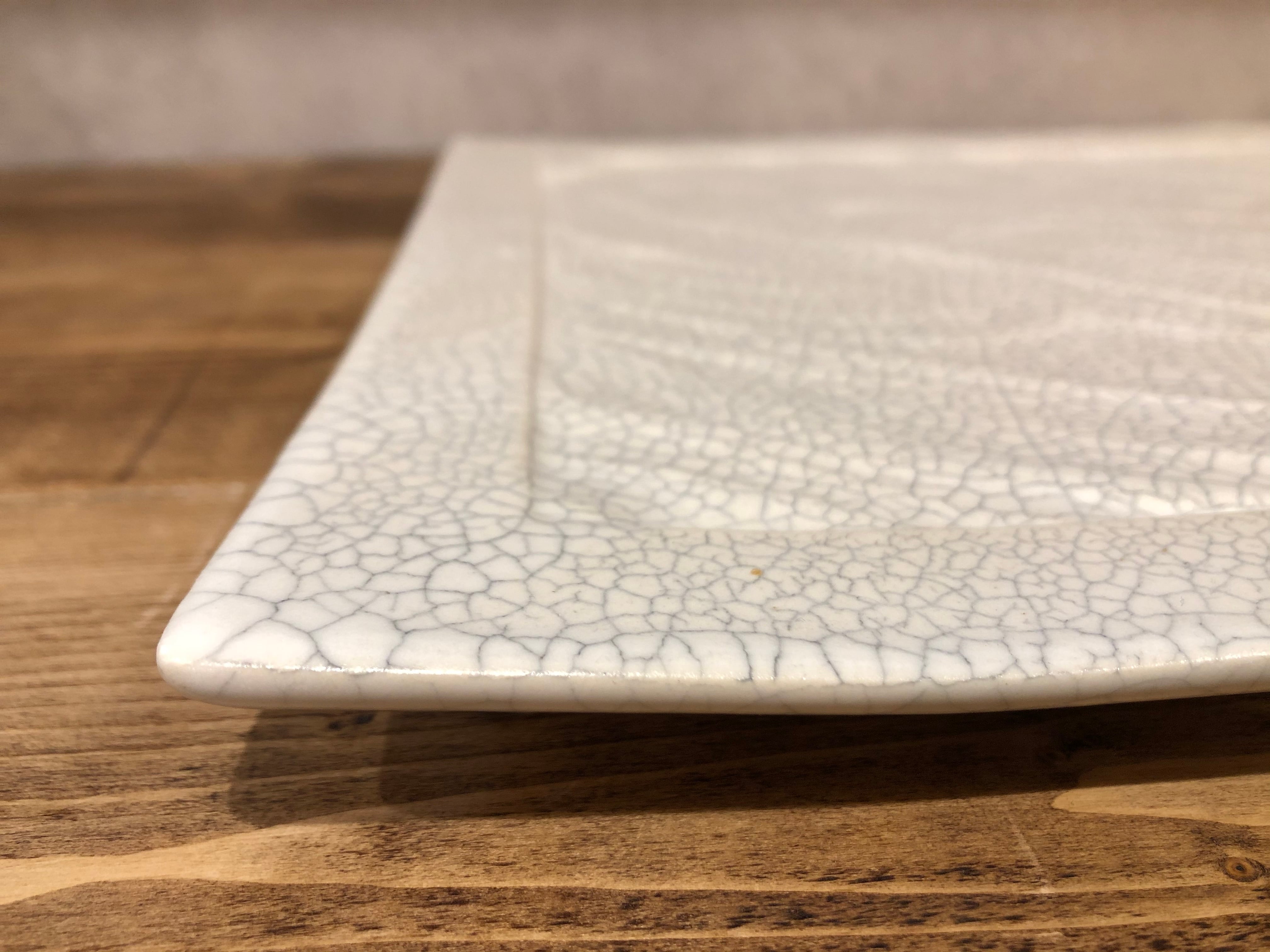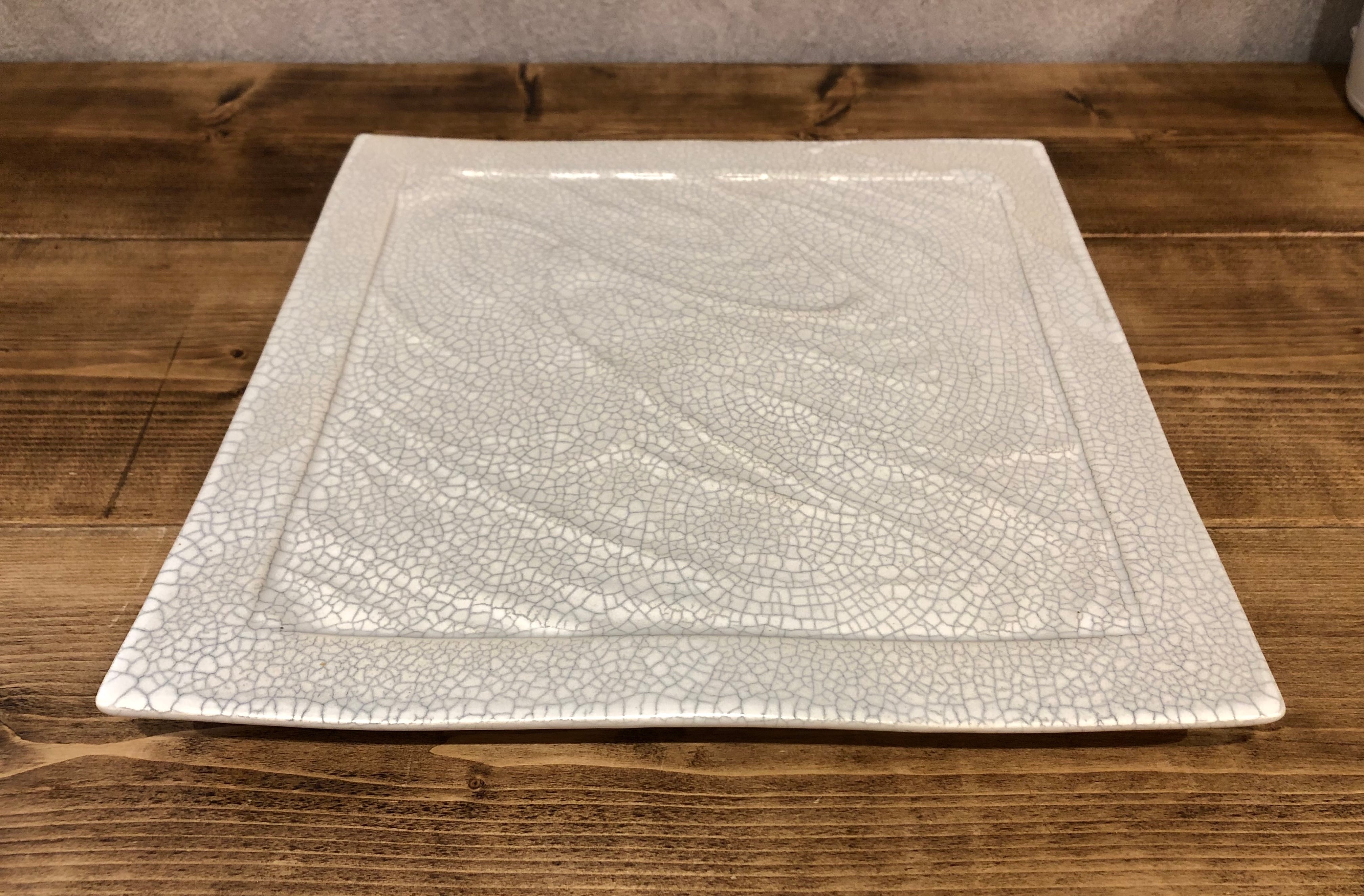 足つきで扱い易くしたプレート皿です。真っ白ではなく独特の模様が浮かび上がり、波模様の細工が高級感を醸し出しています。料理の色彩が鮮やかに映えます。